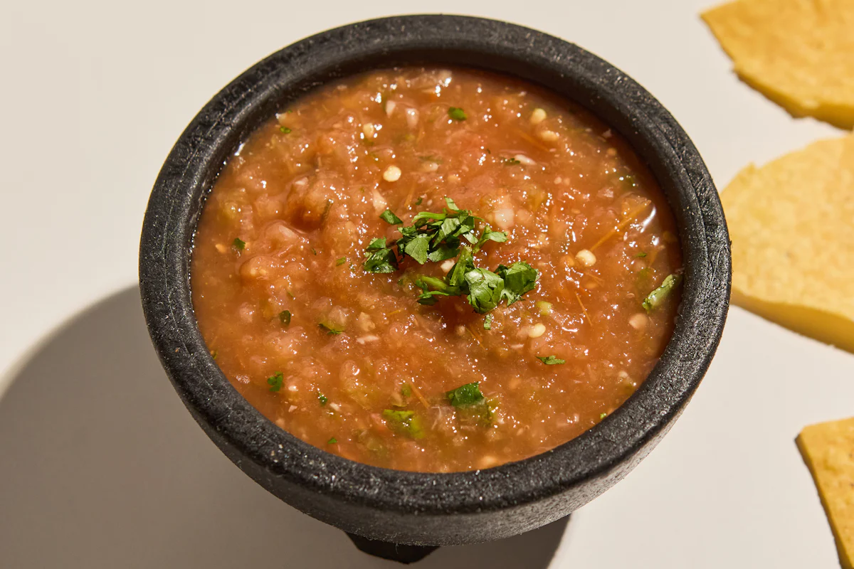 Roma tomatoes, jalapeños, green pepper, Spanish onion, garlic, lime, herbs, and spices | (Veg/V/GF)