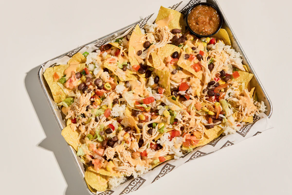 Rice, black beans, queso blanco, choice of protein, lettuce, tomatoes, cilantro + onions, pickled jalapeños, corn salsa, and house salsa over housemade chips | (D/GF)