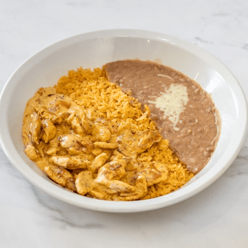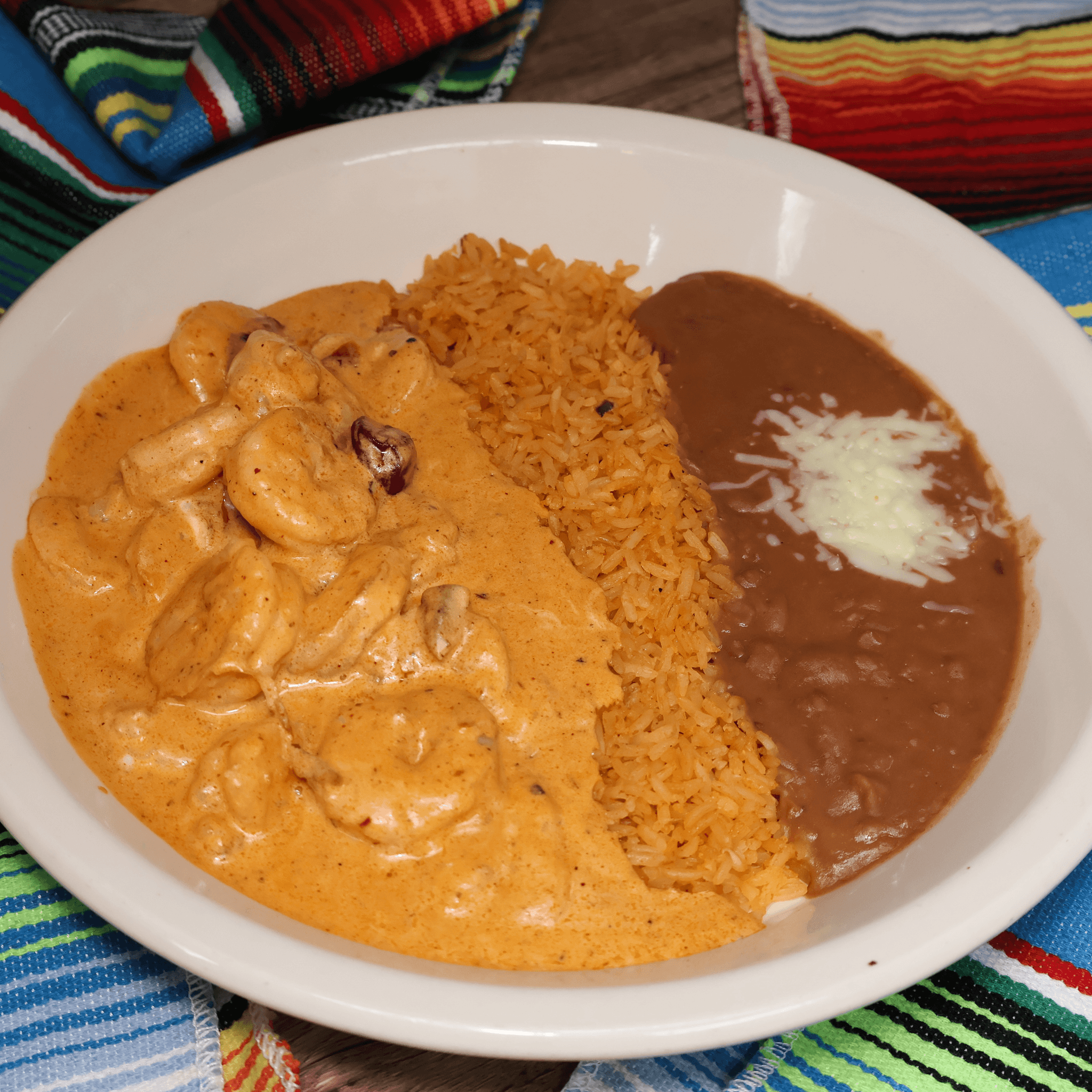 Shrimp with chipotle cream sauce served with rice, beans, lettuce, tomato, and your choice of corn or flour tortilla