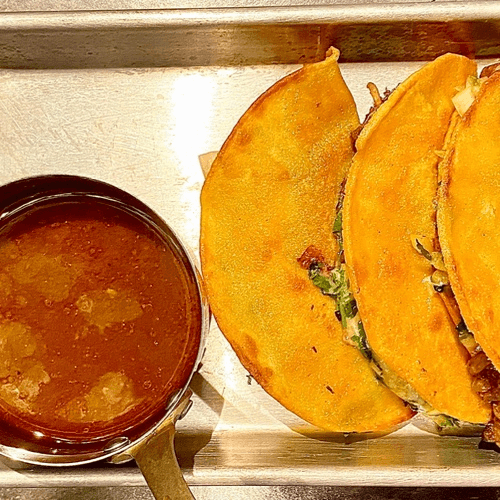 Three birria quesadillas with cheese, cilantro and onions inside. Served with a side of broth.