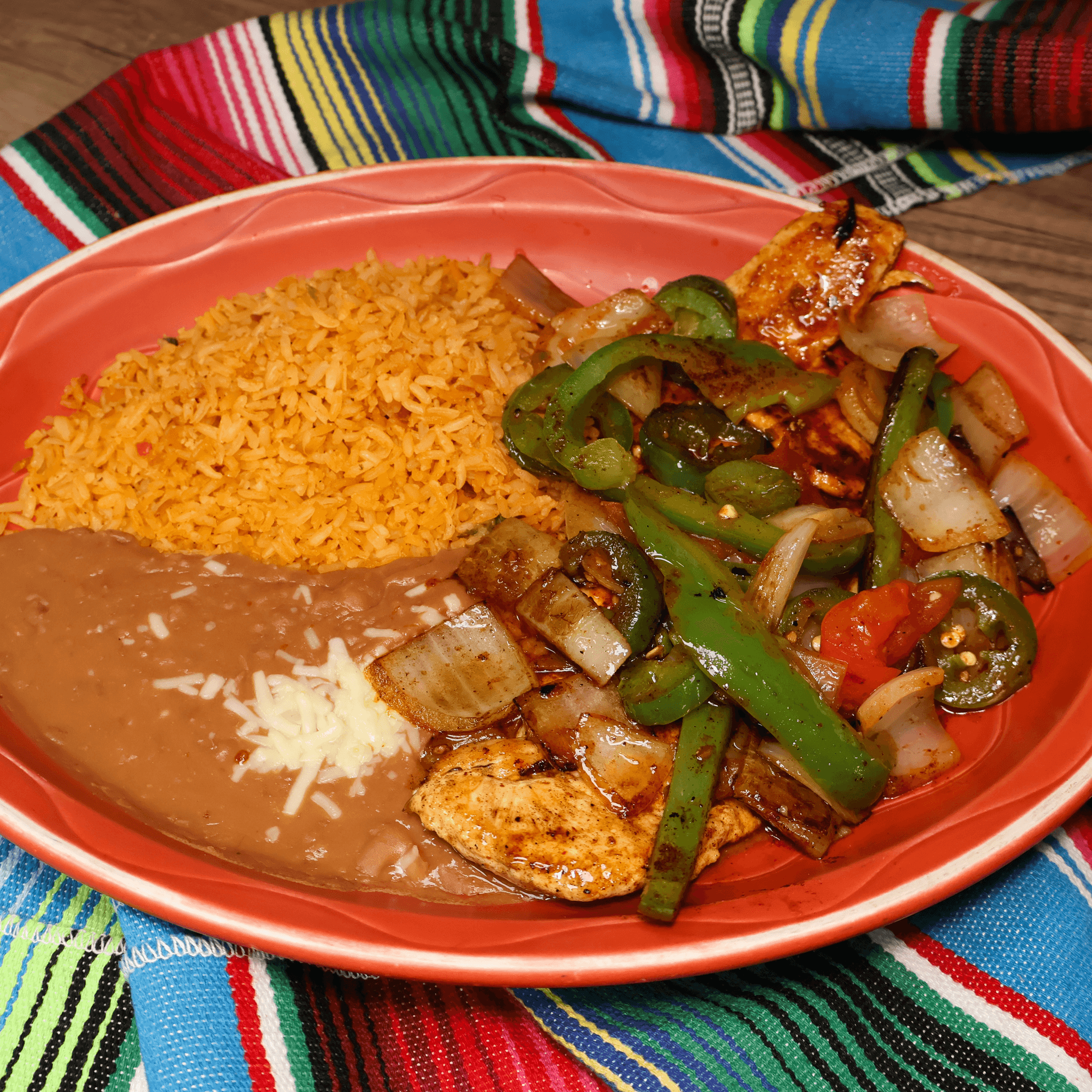 Chicken, rice, onions, tomatoes and bell peppers grilled to perfect, topped with cheese, garnished with lettuce, tomato sour cream and avocado slices. Served with rice
