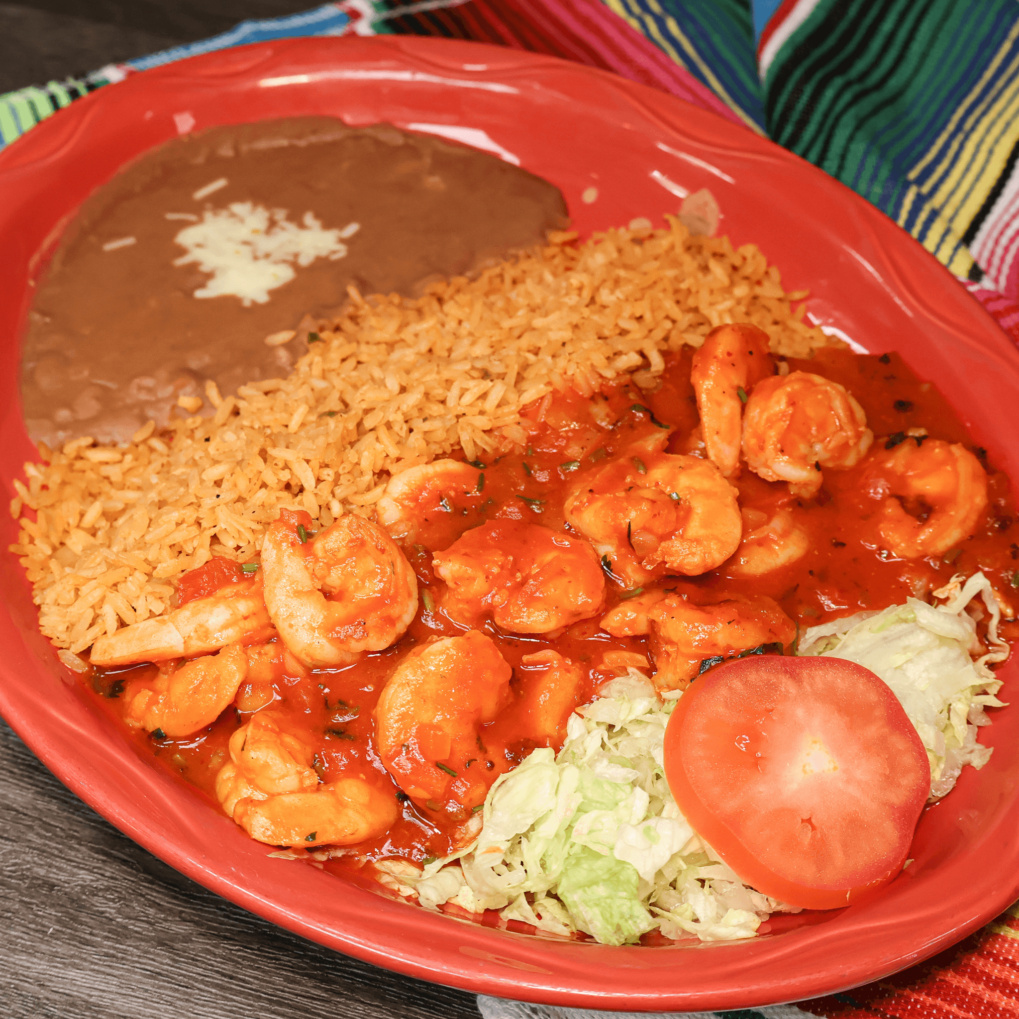 Shrimp with spicy red sauce and onions served with rice, beans, lettuce, tomato, and your choice of corn or flour tortilla