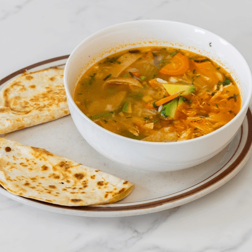 A 14 oz bowl of our famous chicken soup with two small cheese quesadillas