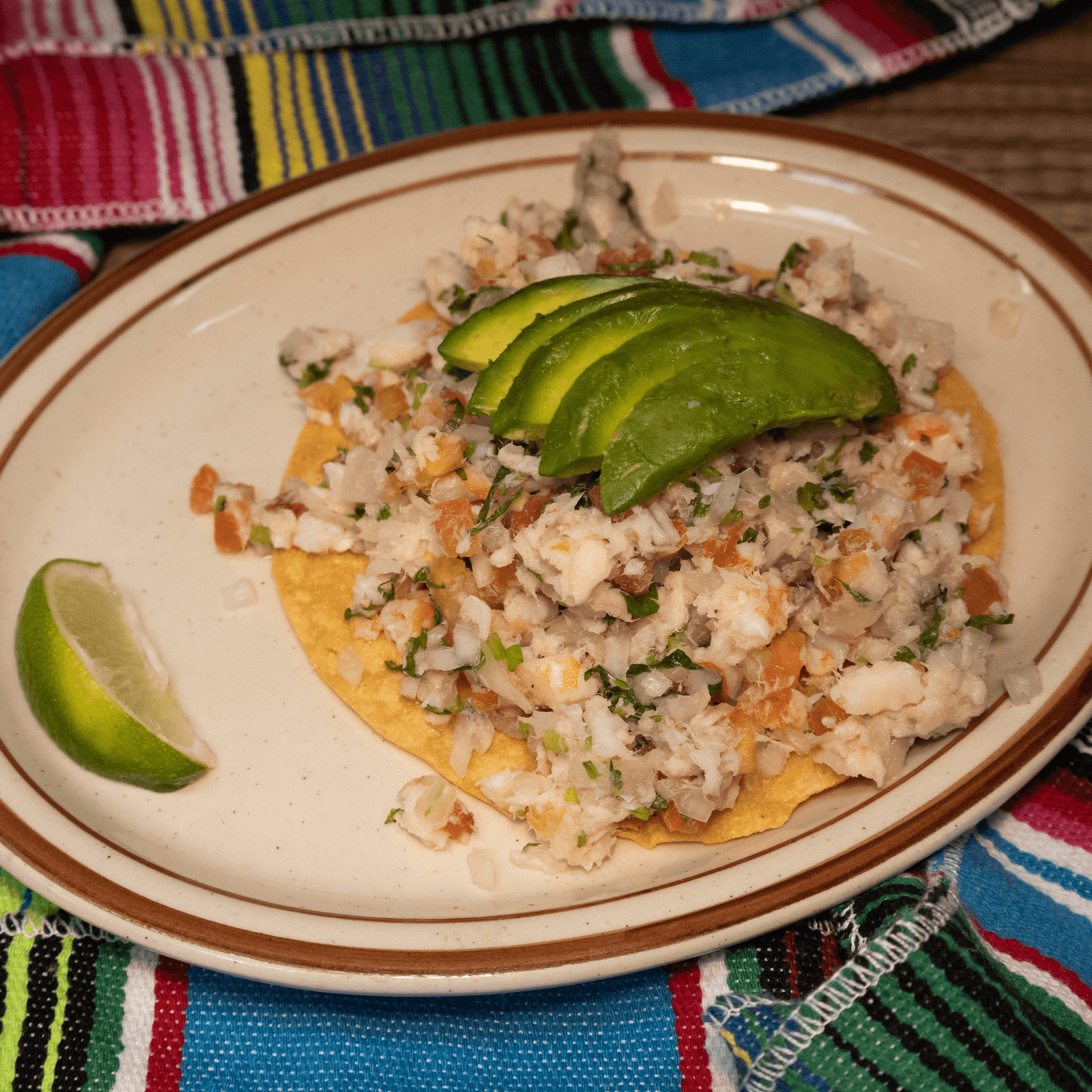 Shrimp and fish cooked in lime juice with onions tomatoes, cilantro and avocado on a tostada.