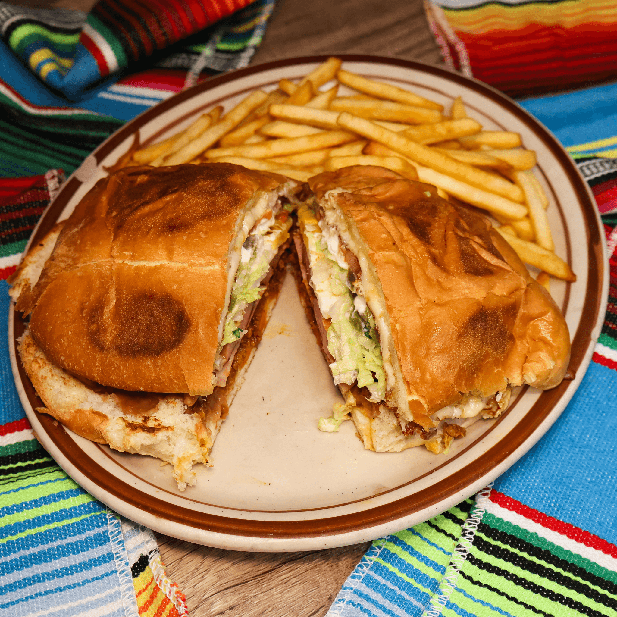 Traditional Mexican sandwich prepared with beans lettuce, tomato, jalapeños, guacamole, cheese & sour cream