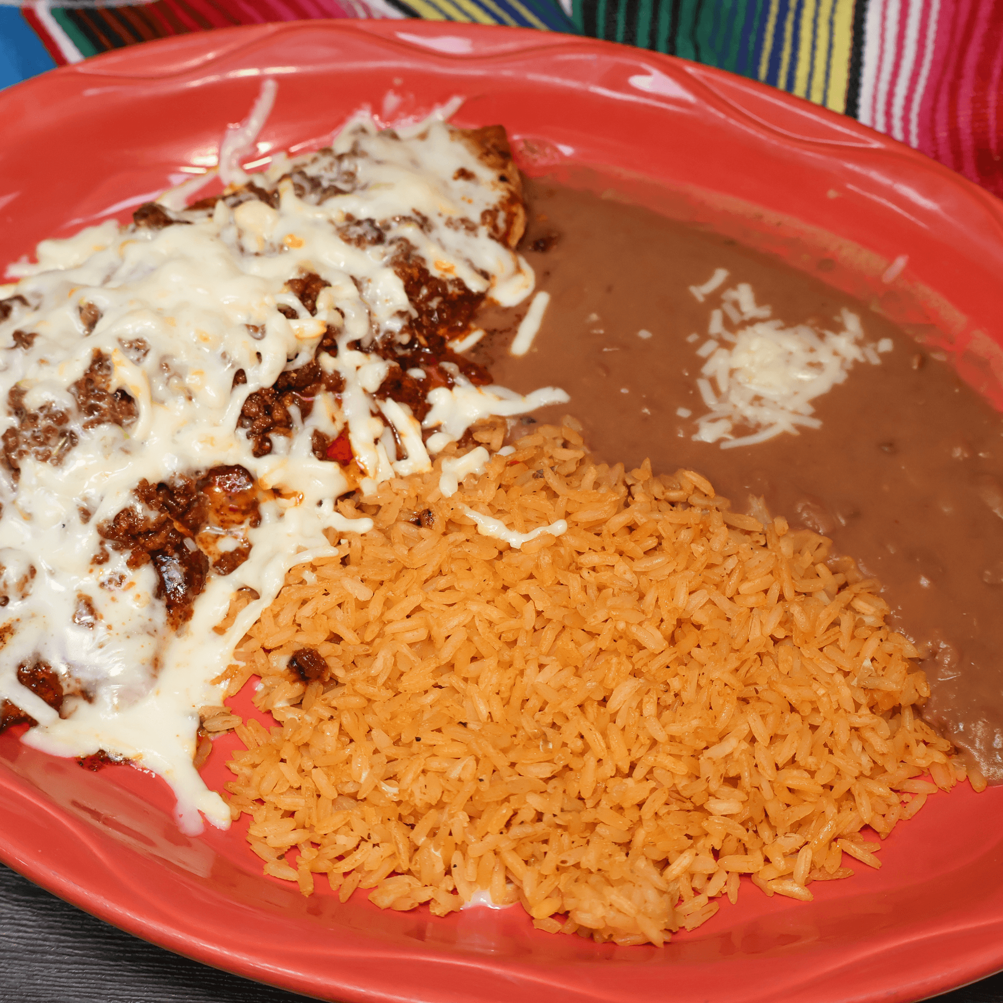 Two Deep fried flour tortillas (one chicken and rice, one ground beef) topped with nacho cheese. Served with rice, beans, lettuce, tomato, sour cream