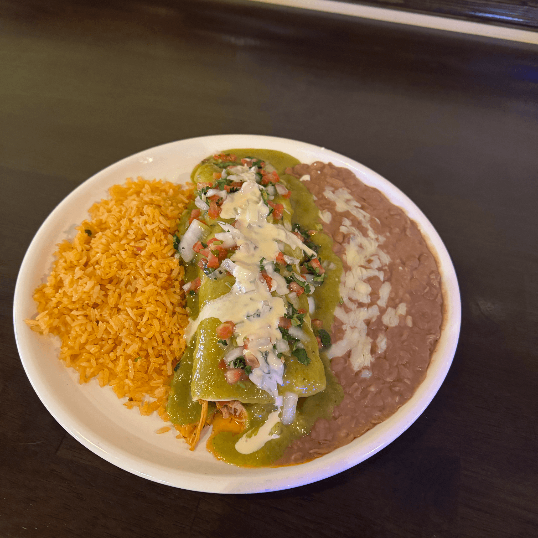 Order of three enchiladas stuffed with chicken topped with traditional green sauce; served with rice and beans