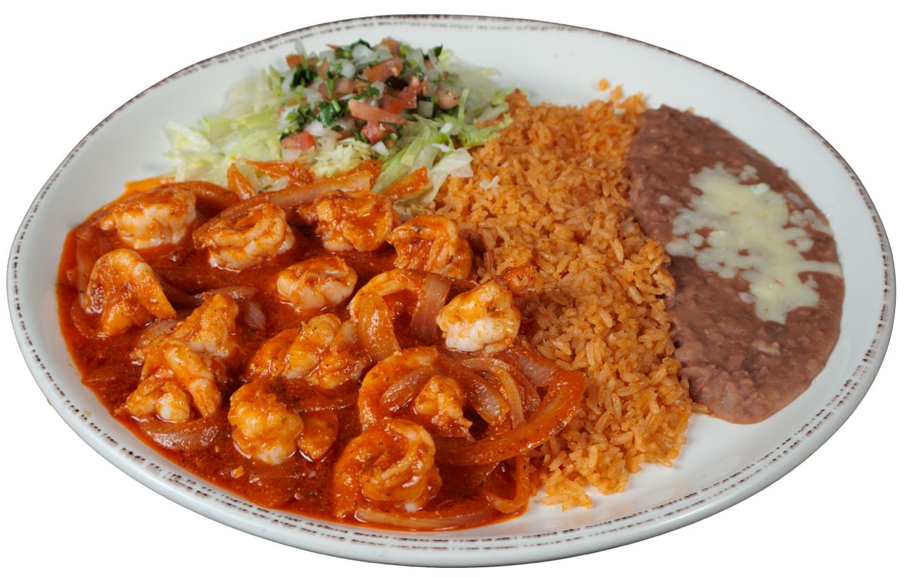 Shrimp with spicy red sauce and onions. Served with rice, beans, salad and corn or flour tortillas.