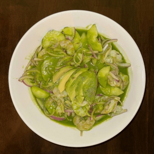 Shrimp with jalapeño, tomatoes and onions. Served with rice, beans, salad and corn or flour tortillas.