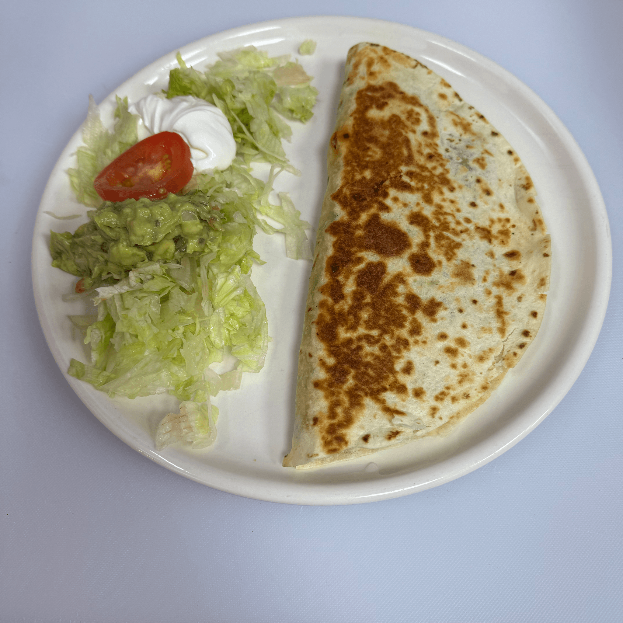 A flour tortilla grilled and stuffed with cheese, beef and beans or chicken and beans; served with rice, lettuce, tomato, guacamole and sour cream