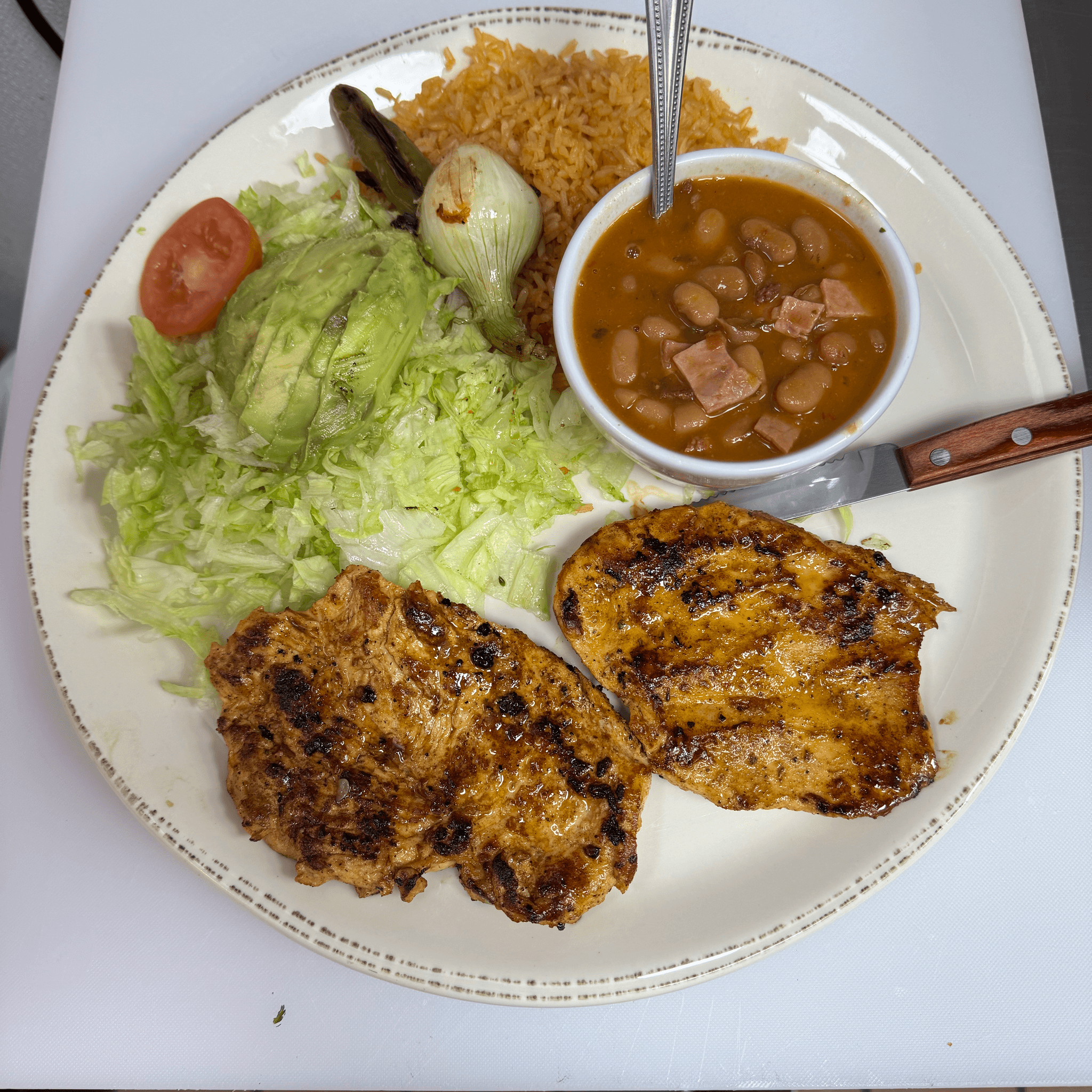 Grilled chicken breast. Served with rice, beans, corn or flour tortillas