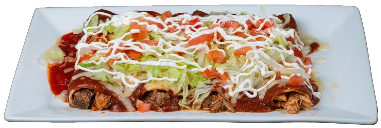 Four deep-fried rolled tortillas stuffed with chicken served with rice, lettuce, tomato, guacamole, sour cream and fresh Mexican cheese.