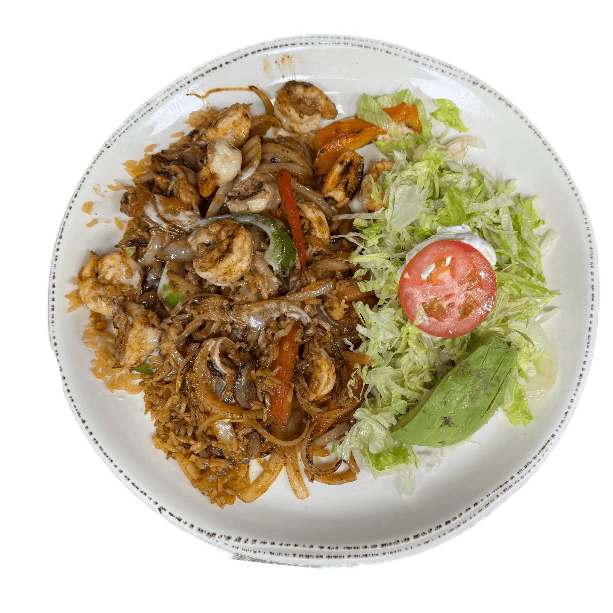 Shrimp, rice, onions, tomatoes and bell peppers grilled to perfection, topped with cheese; garnished with lettuce, tomato, sour cream and avocado slices. Served with rice, French fries, salad and corn or flour tortillas
