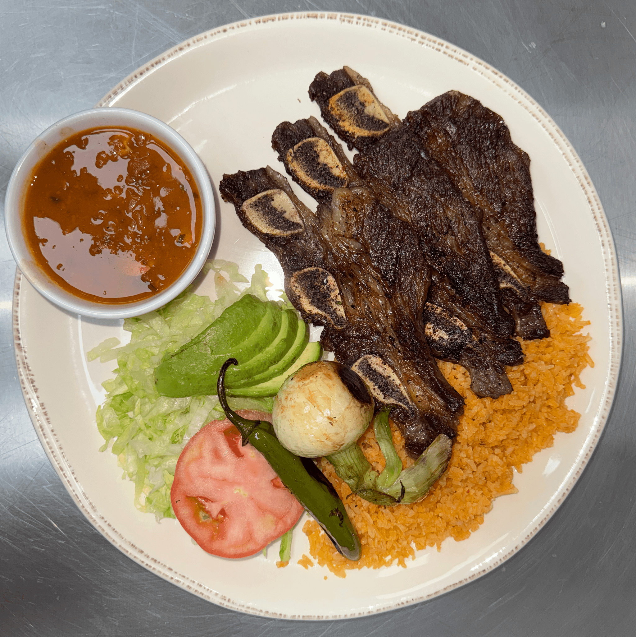 10 oz rib eye steak, with fresh sauted garlic and diabla salsa sauce Served with White rice, lettuce pico de gallo & avocado. corn or flour tortillas.