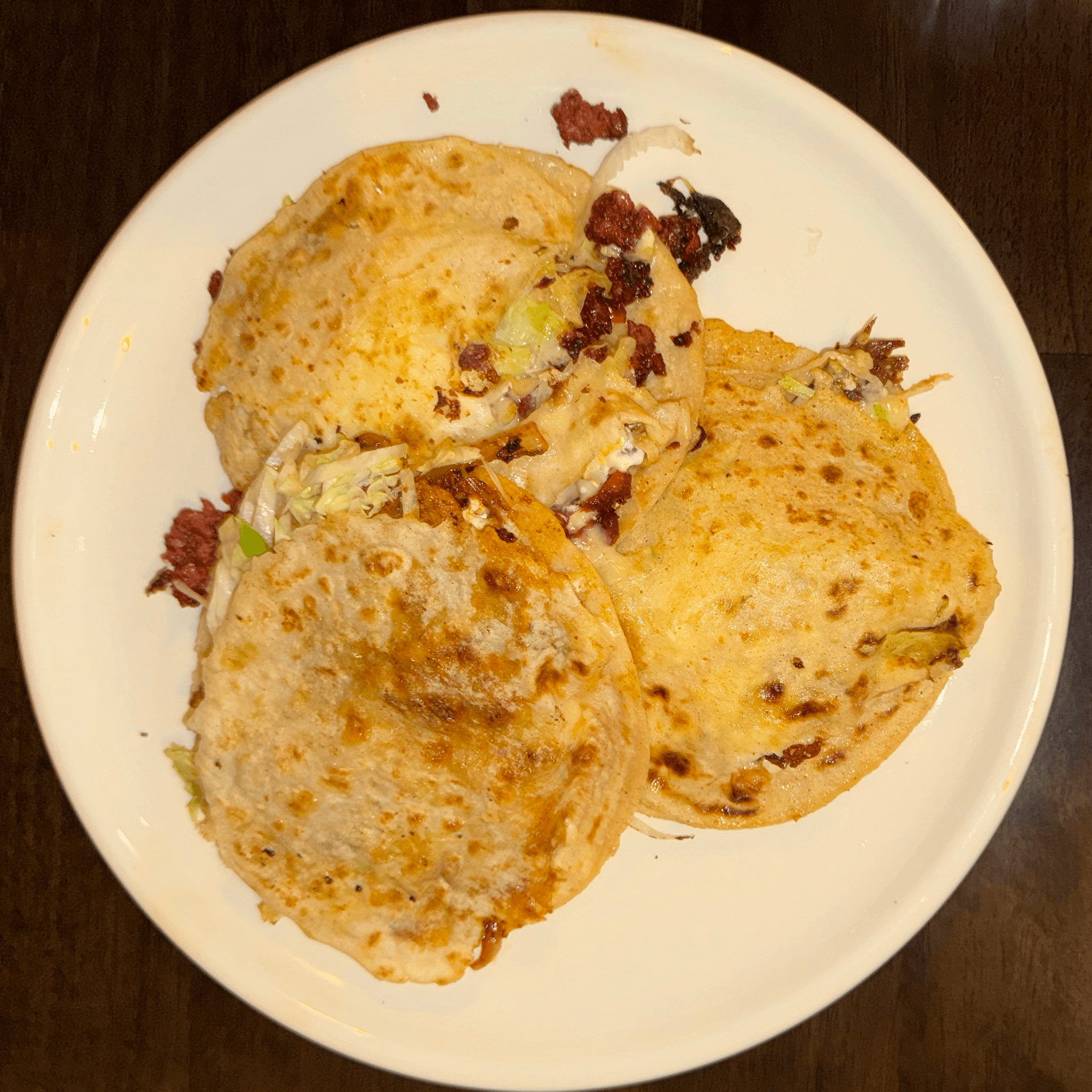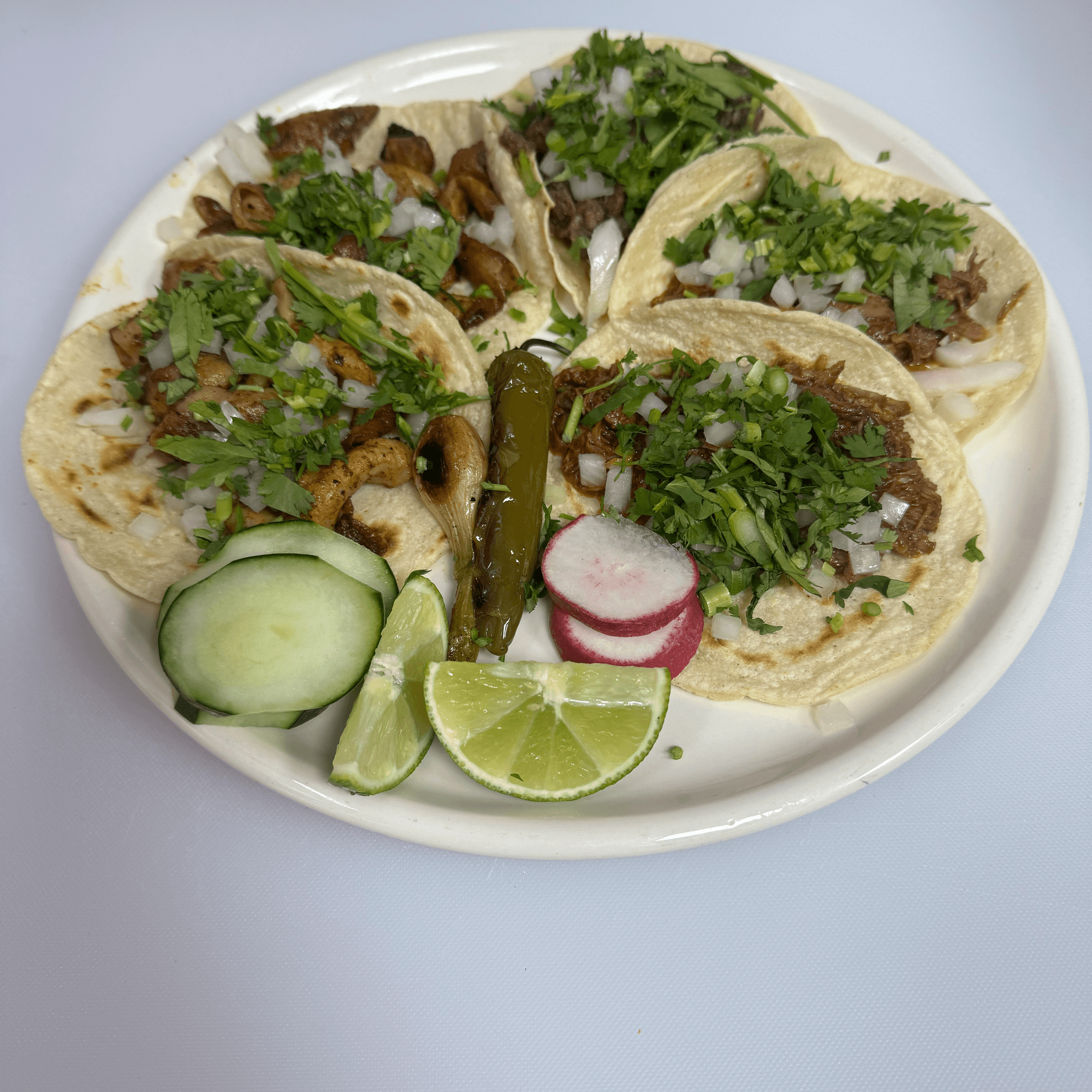 Chorizo, pollo y nopales. Made with soft corn tortillas and topped with cilantro and onion.