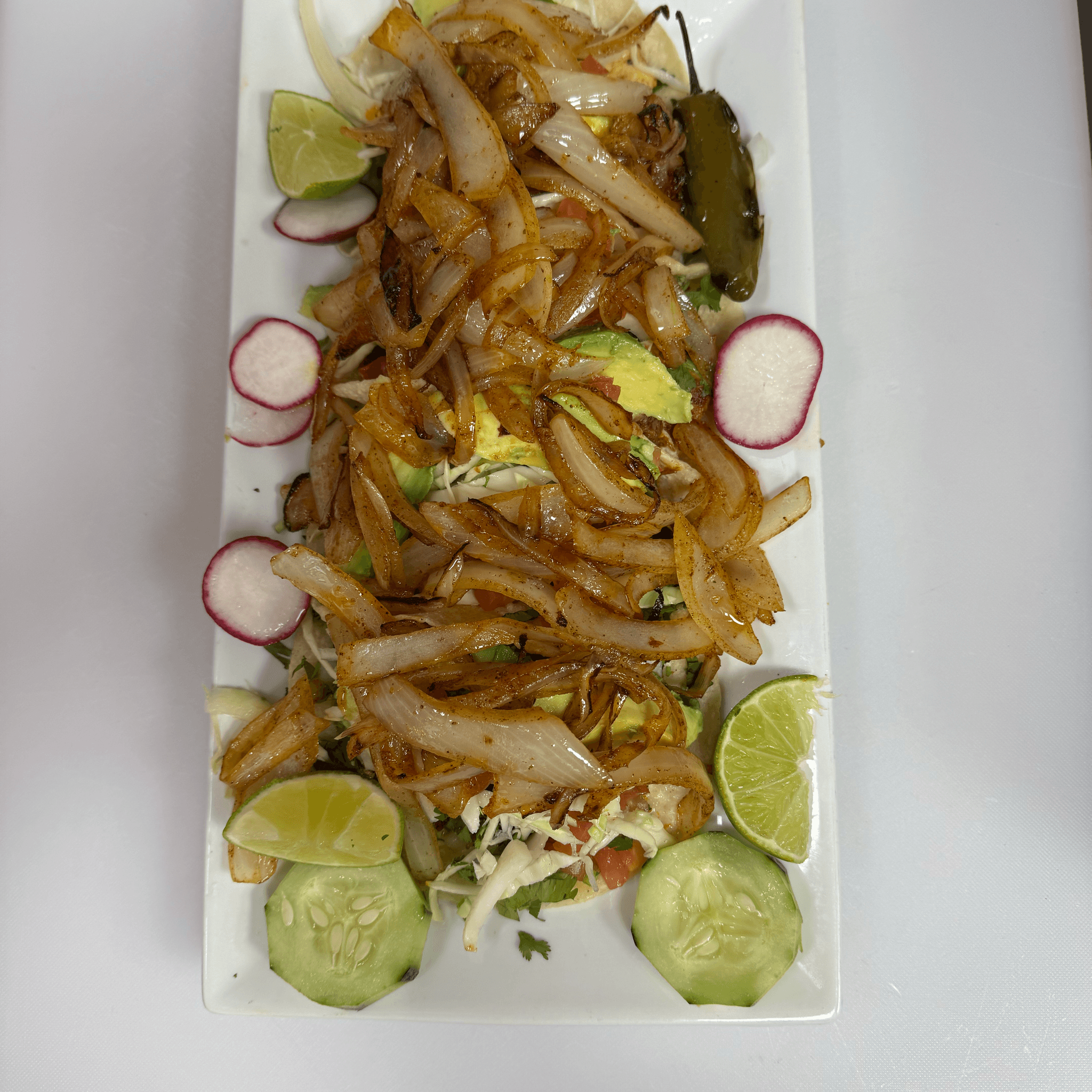 Bell peppers, onions, tomatoes, mushrooms and mixed vegetables; with lettuce and sour cream. Served with rice, beans and corn or flour tortillas.