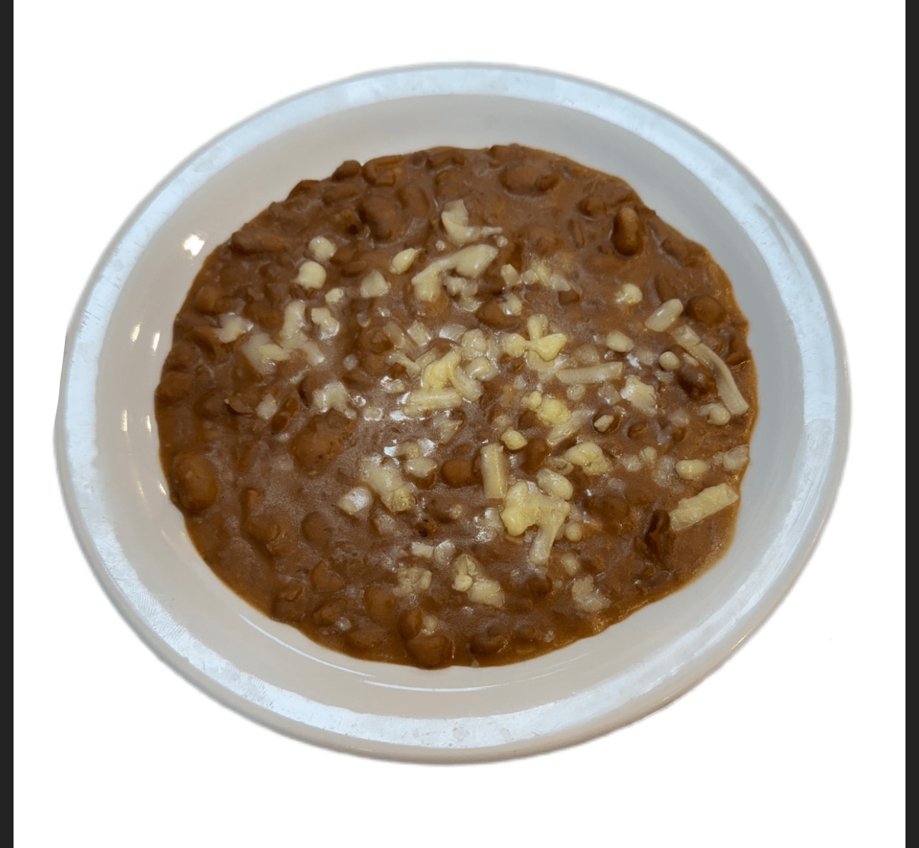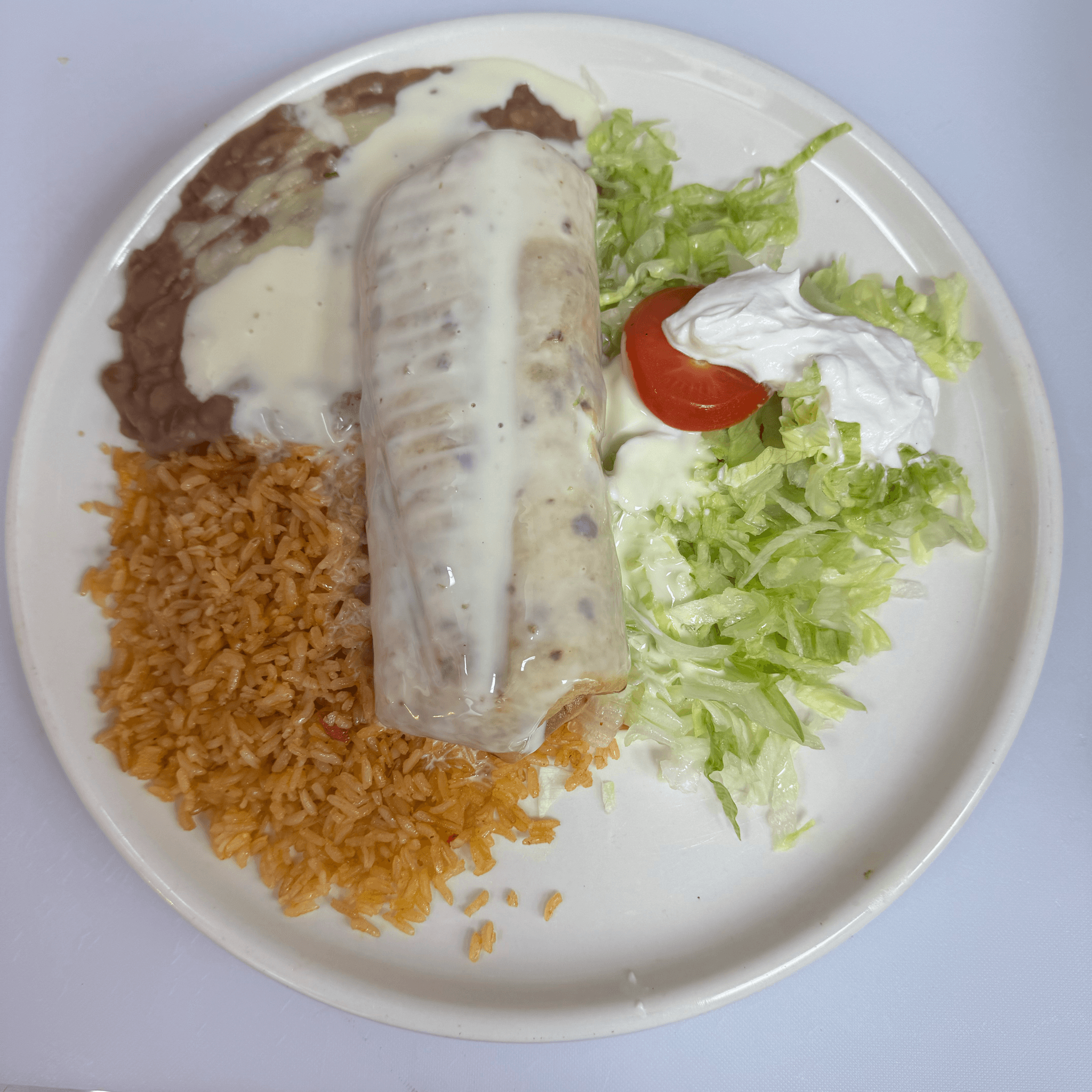 One burrito (chicken and beans or beef and beans) topped with green tomatillo salsa, pico de gallo and cheese sauce; served with rice and beans
