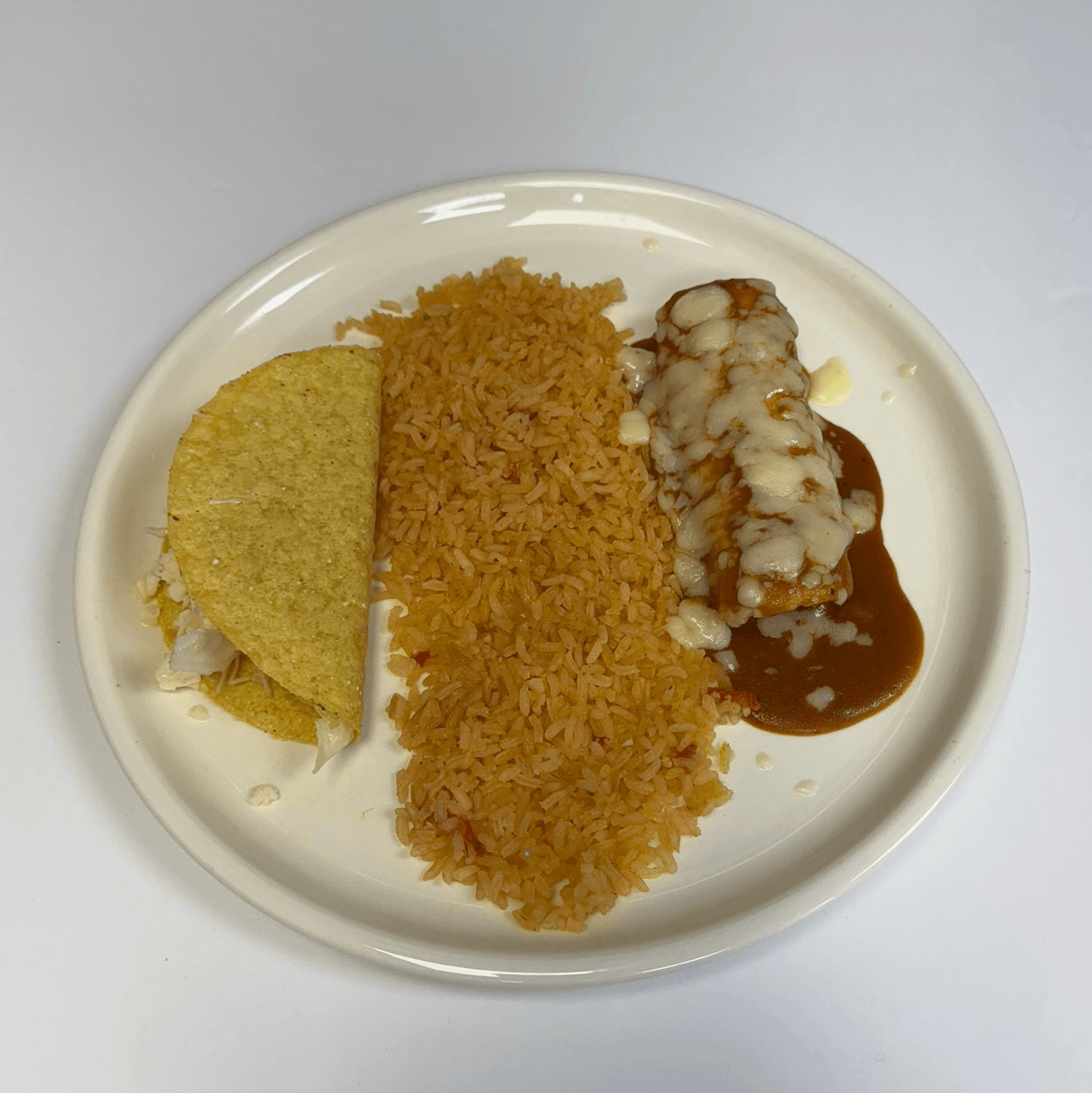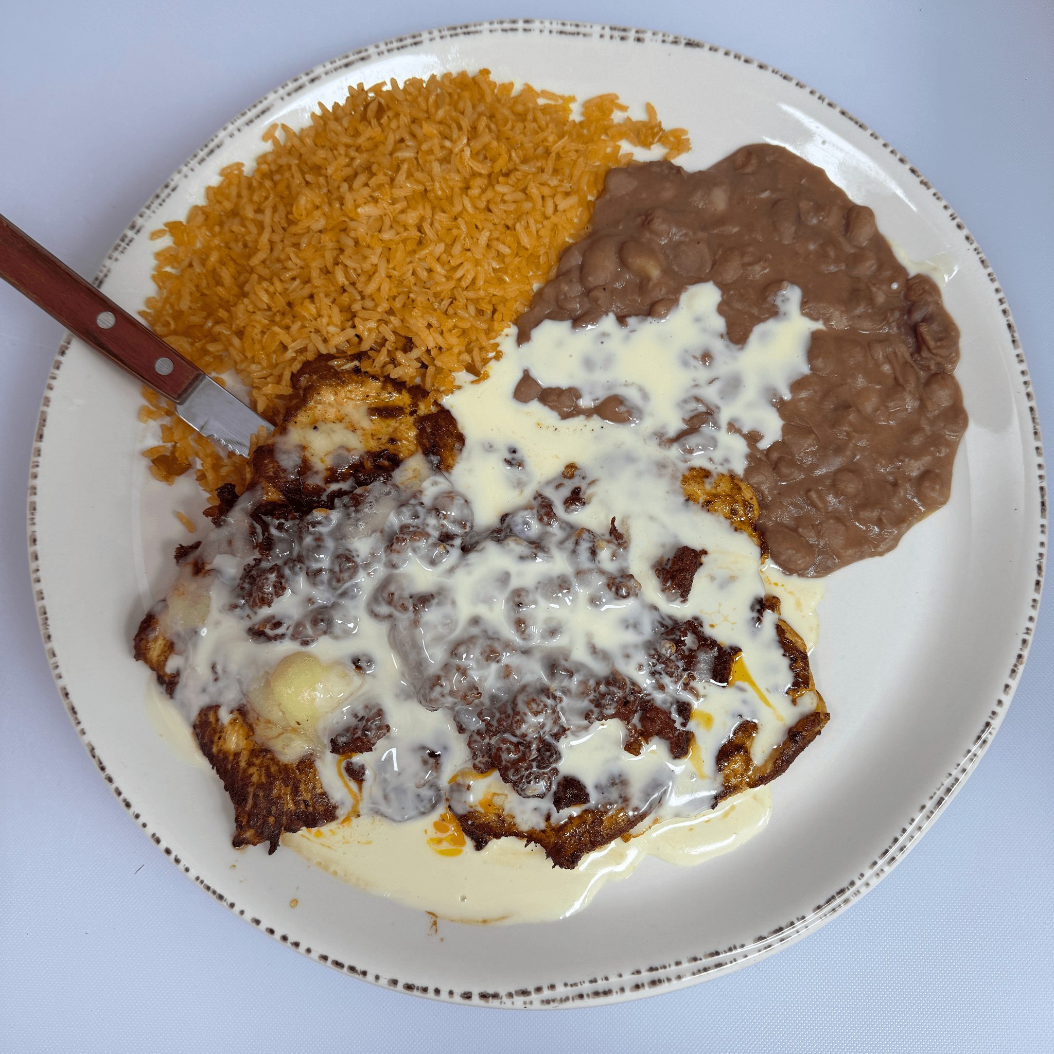 Two deep-fried tortillas (one chicken, one ground beef). Topped with nacho cheese; served with rice, beans, lettuce, tomato & sour cream.