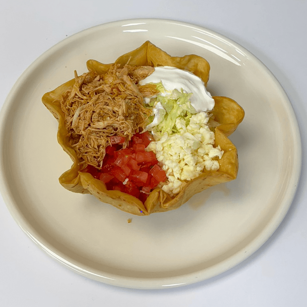 Crispy flour tortilla, chicken or beef, beans, lettuce, tomatoes, cheese and sour cream