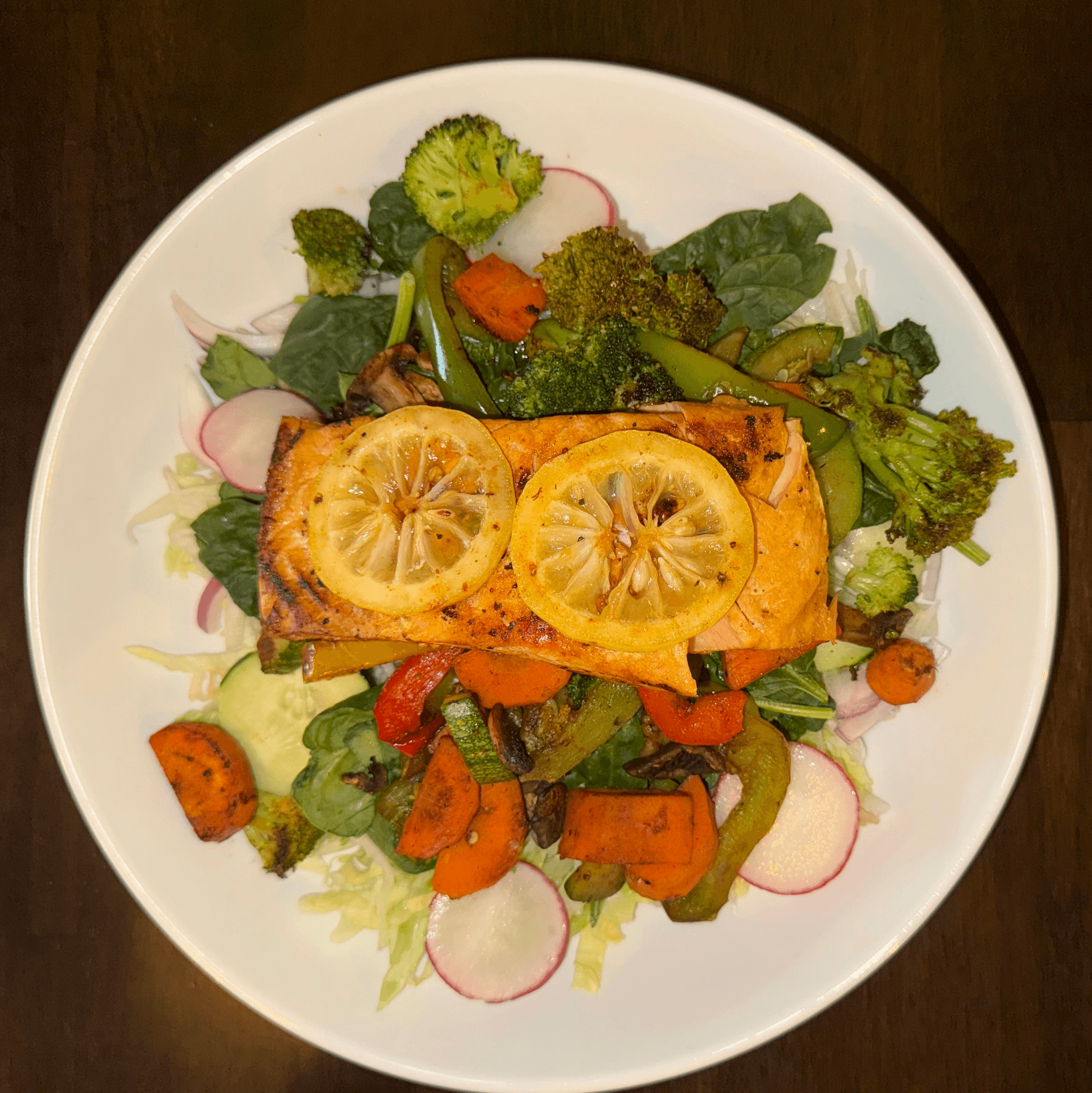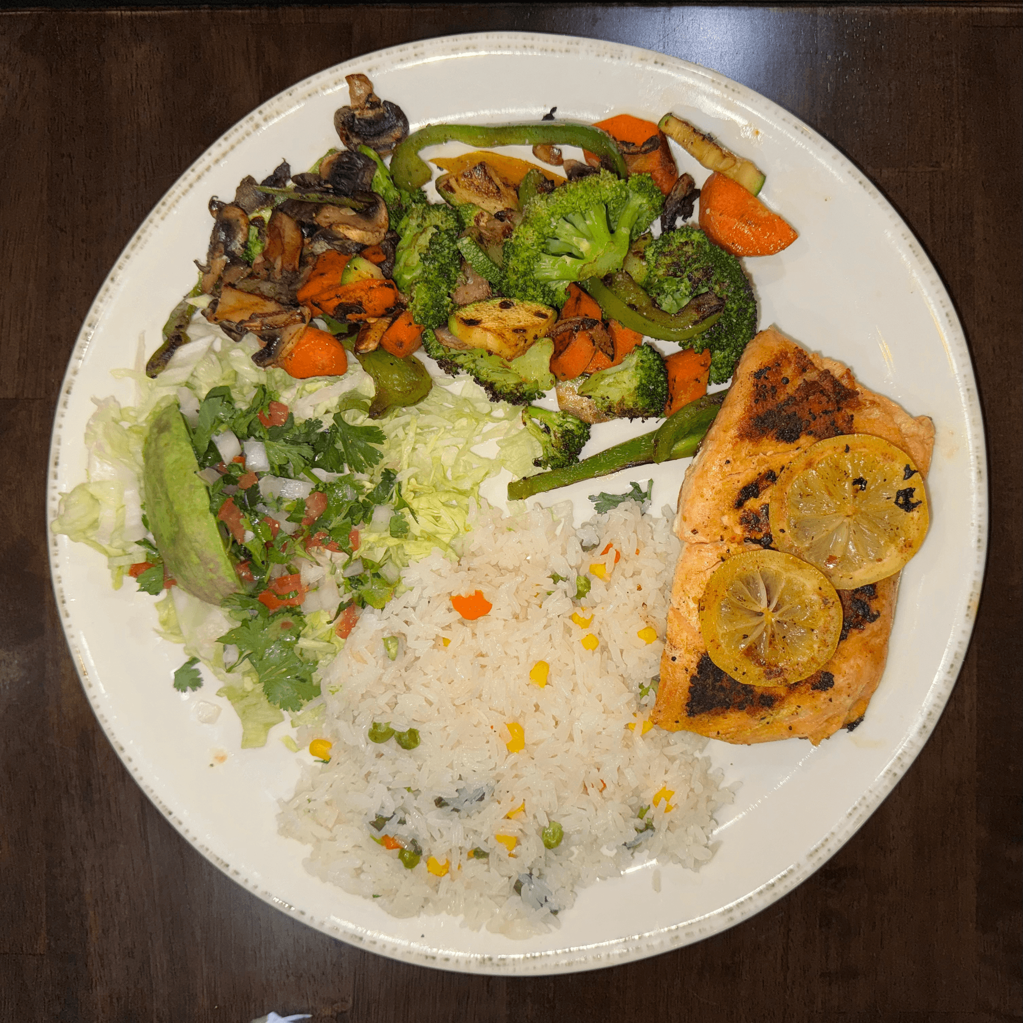 Filet grilled salmon with a touch of lemon, served with rice, grilled veggies, a small salad and avocado