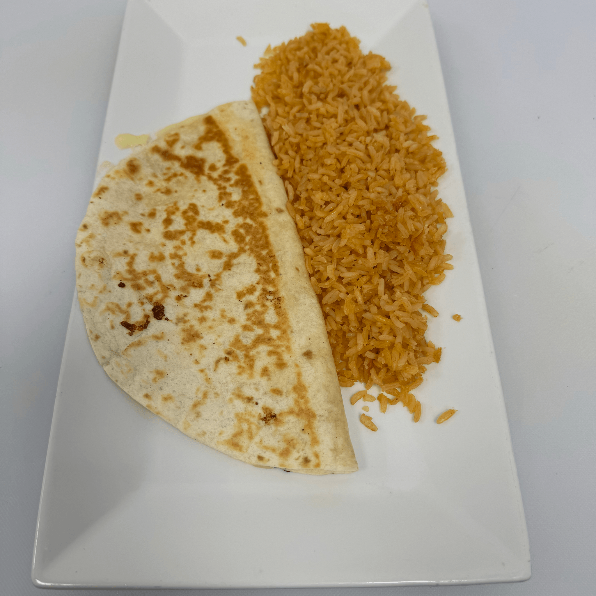 Two flour tortillas (soft or deep-fried), filled, with chicken and topped with cheese and sour cream; served with rice