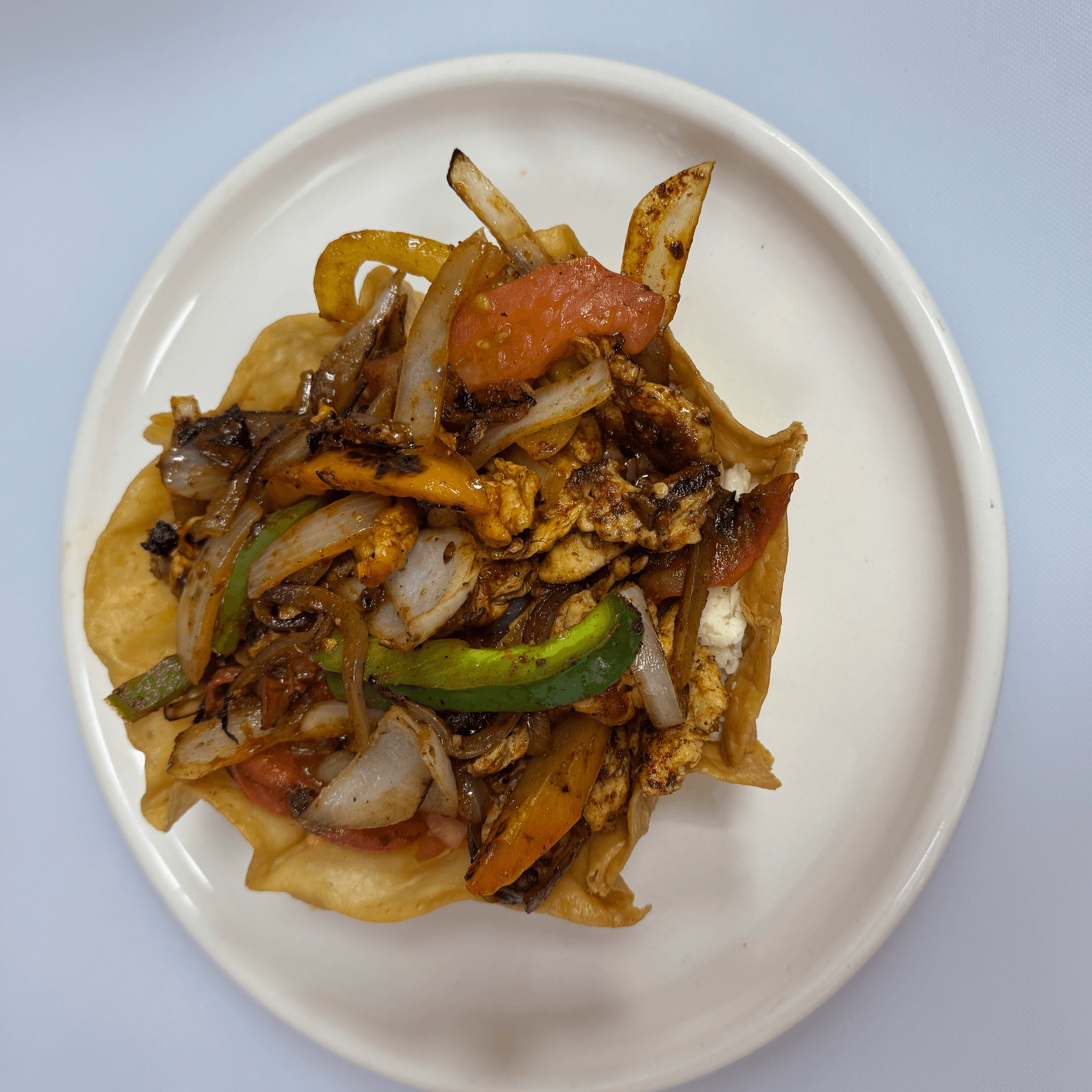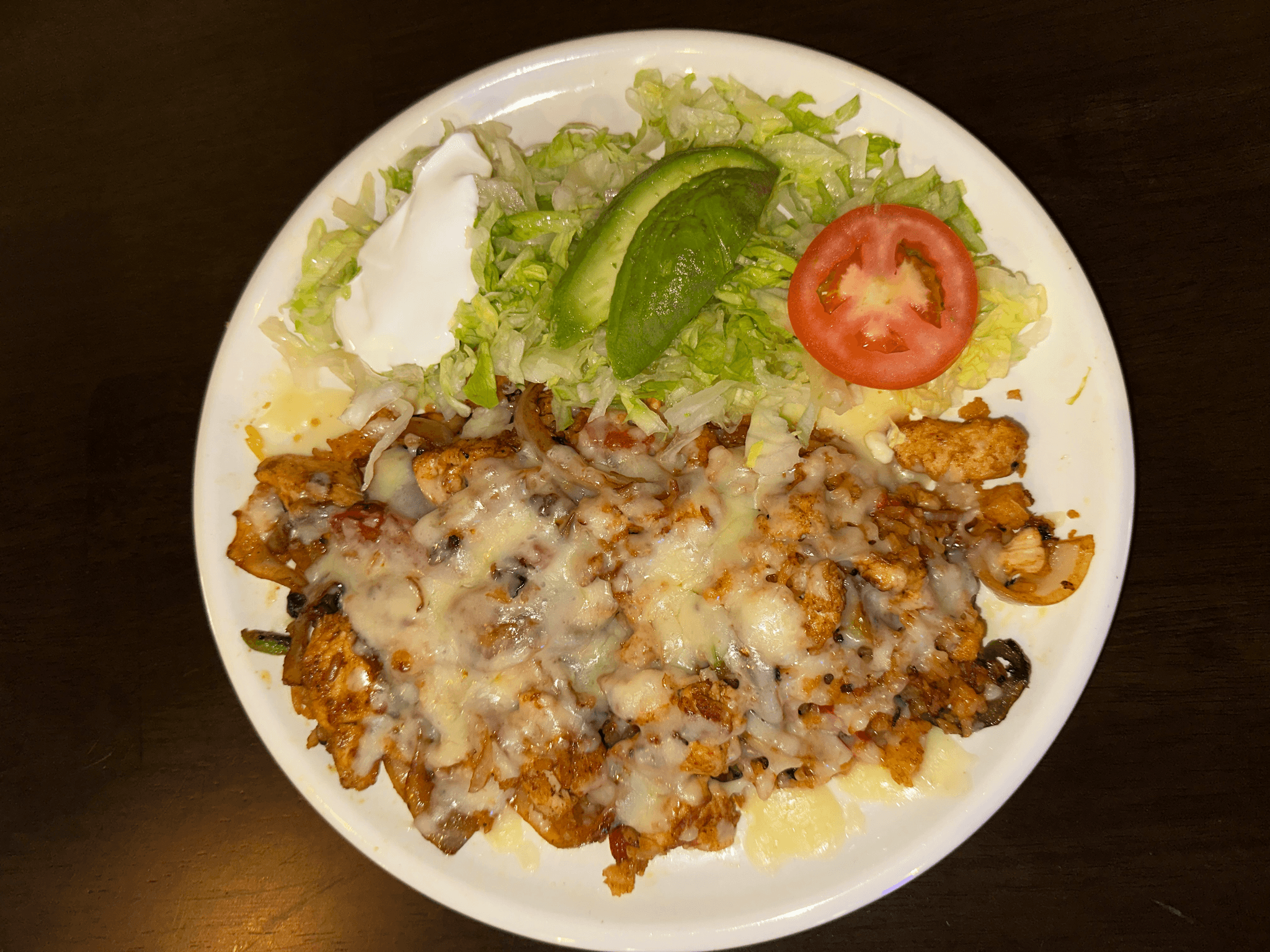 Chicken, rice, onions, tomatoes and bell peppers grilled to perfection, topped with cheese, garnished with lettuce, tomato, sour cream and avocado slices. corn or flour tortillas