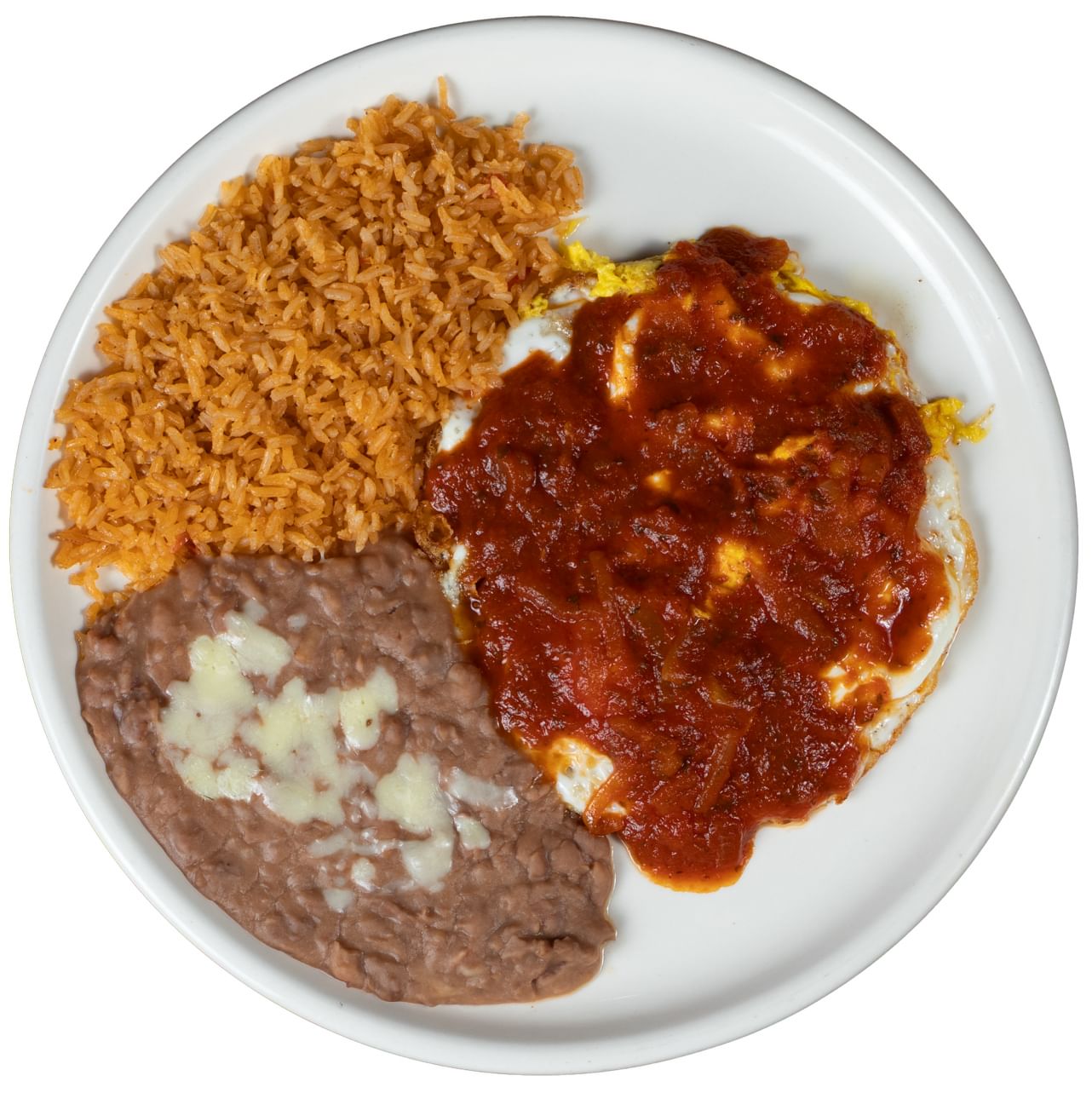 Eggs, cheese, onions, tomatoes and your choice of mexican sausage, ham, bacon, wieners, green chiles or mushrooms. Servidos con arroz, frijoles refritos y tortillas; maiz o harina / served with rice, refried beans and tortillas: corn or flour