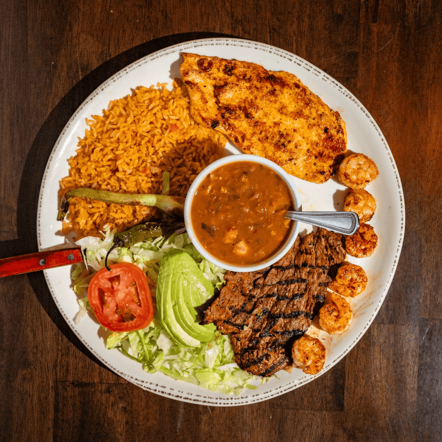 Steak chicken & shrimp grilled onions tomatoes bell peppers. Served with rice and beans. lettuce tomato & sour cream