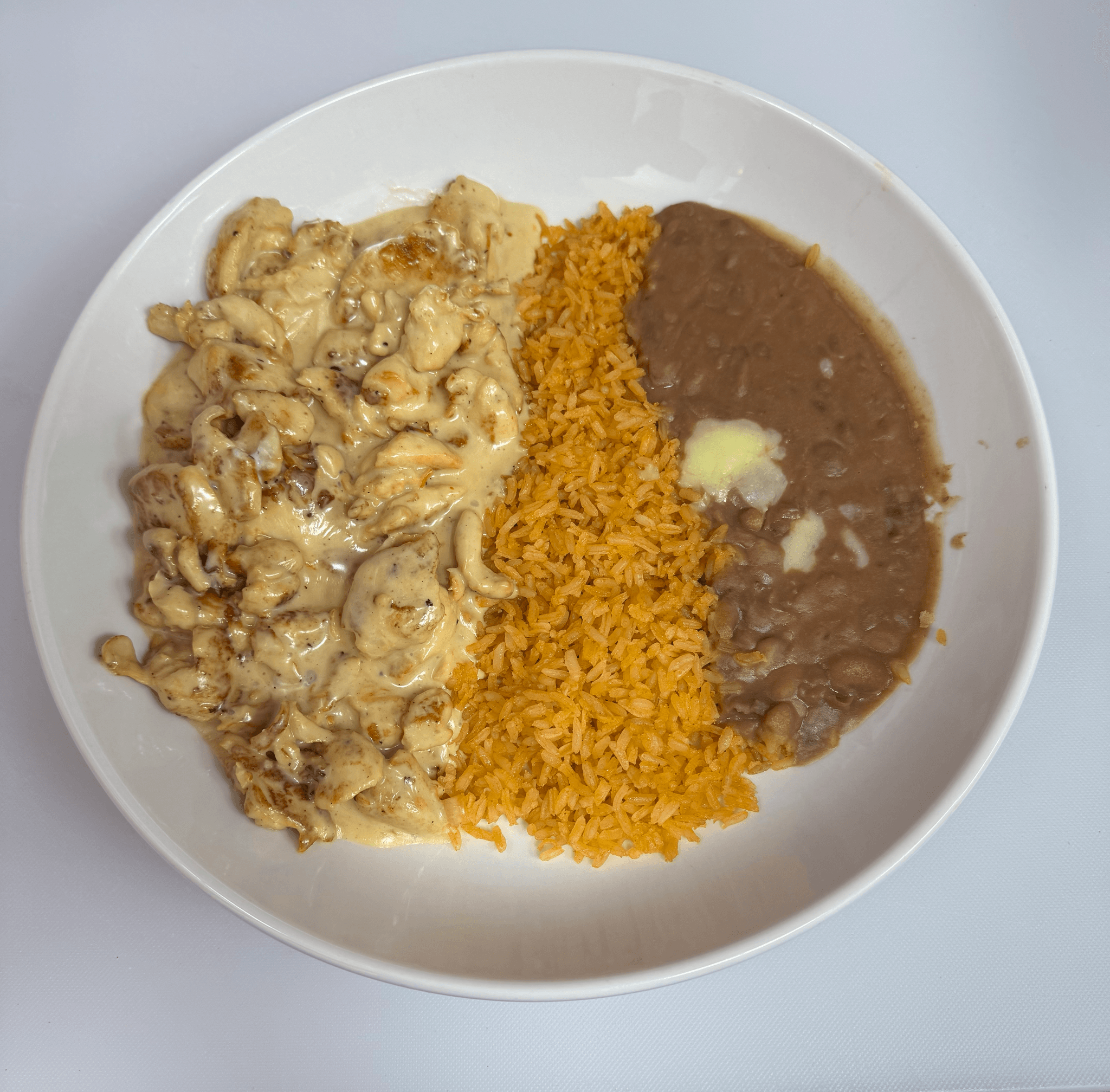 10 oz rib eye steak, with grilled onions/mushrooms in a creamy cheese salsa. Served with rice, beans and corn or flour tortillas.