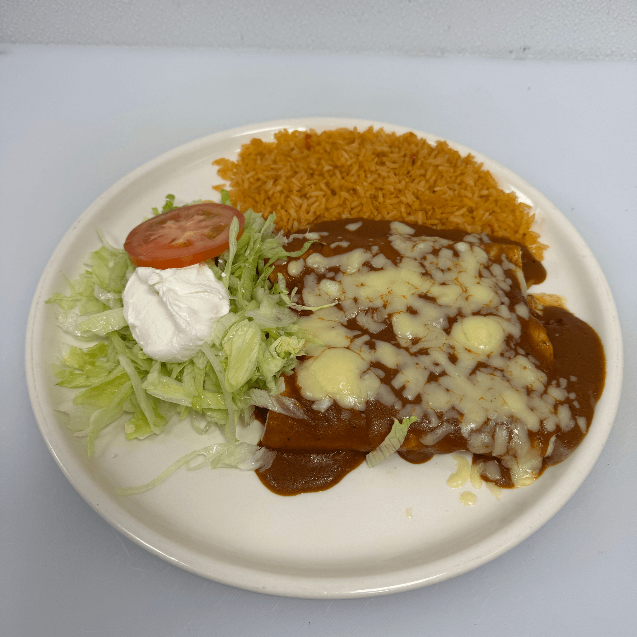 Order of three chicken enchiladas with ranchero sauce; served with rice and guacamole salad