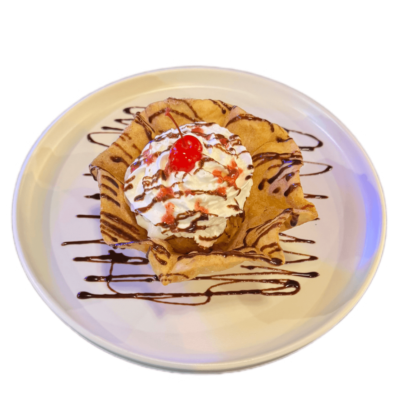 Fried cheesecake in a flour tortilla with honey, cinnamon, sugar, ice cream and whipped cream