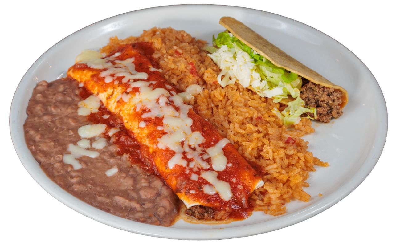 Combination consisting of a chicken enchilada, bean enchilada and a beef enchilada: served with rice, lettuce, tomato and sour cream