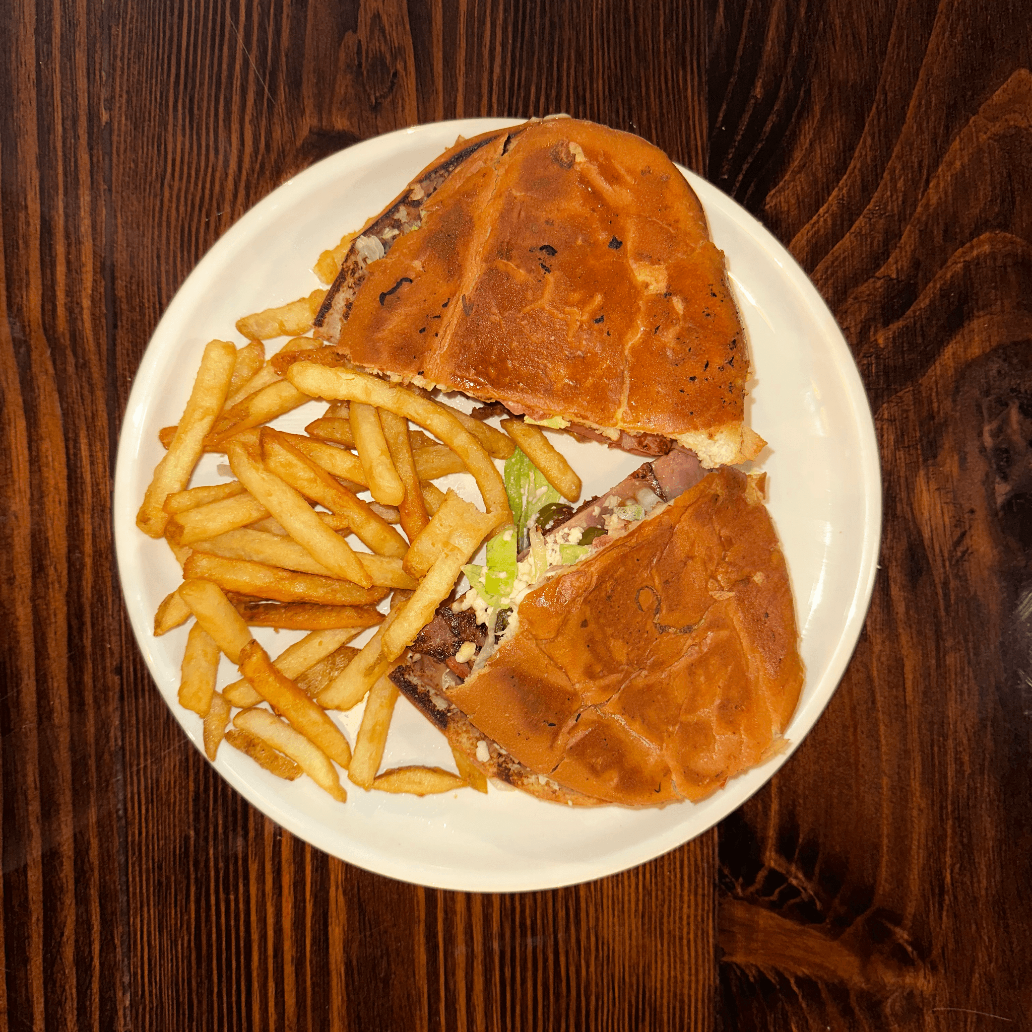 A large flour tortilla filled with sliced steak, grilled onions and Muenster cheese, topped with nacho cheese; served with lettuce, tomato, sour cream, rice and beans