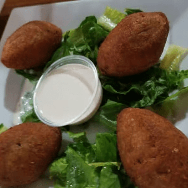 6 persons. Hummus, baba ghanoush, falafel, grape leaves, fattoush, fried kibbeh-baked pies