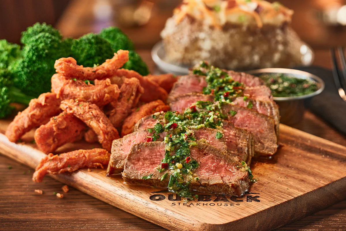 Tender filet, seared and sliced, topped with chimichurri sauce and Bloomin’ Onion® petals. Served with choice of steakhouse potato and a side.