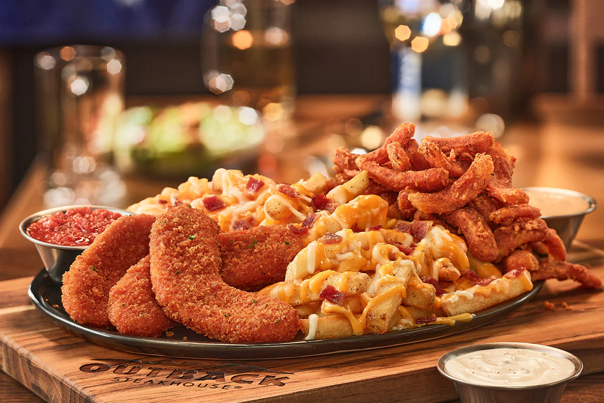 Bloomin’ Onion® petals served with our spicy signature bloom sauce, Fried Mozzarella Bloomerangs with marinara sauce, and Aussie Cheese Fries with house-made ranch dressing.
