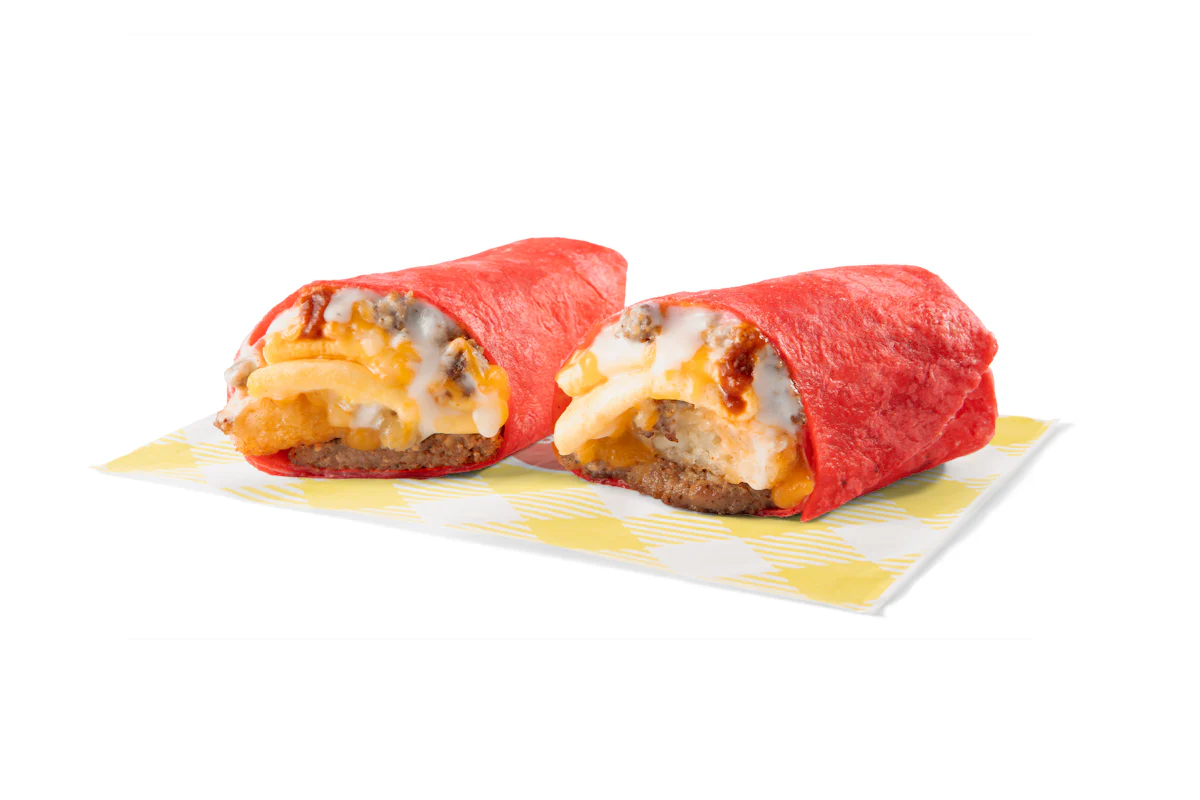 A hearty breakfast burrito featuring our country-style sausage, fluffy eggs, crispy Bo-Rounds®, melty Monterey Jack cheese, and southern sausage gravy, all wrapped in a warm flour tortilla. Served with Texas Pete Hot Sauce. Served with Bo-Tato Rounds®, coffee or medium drink