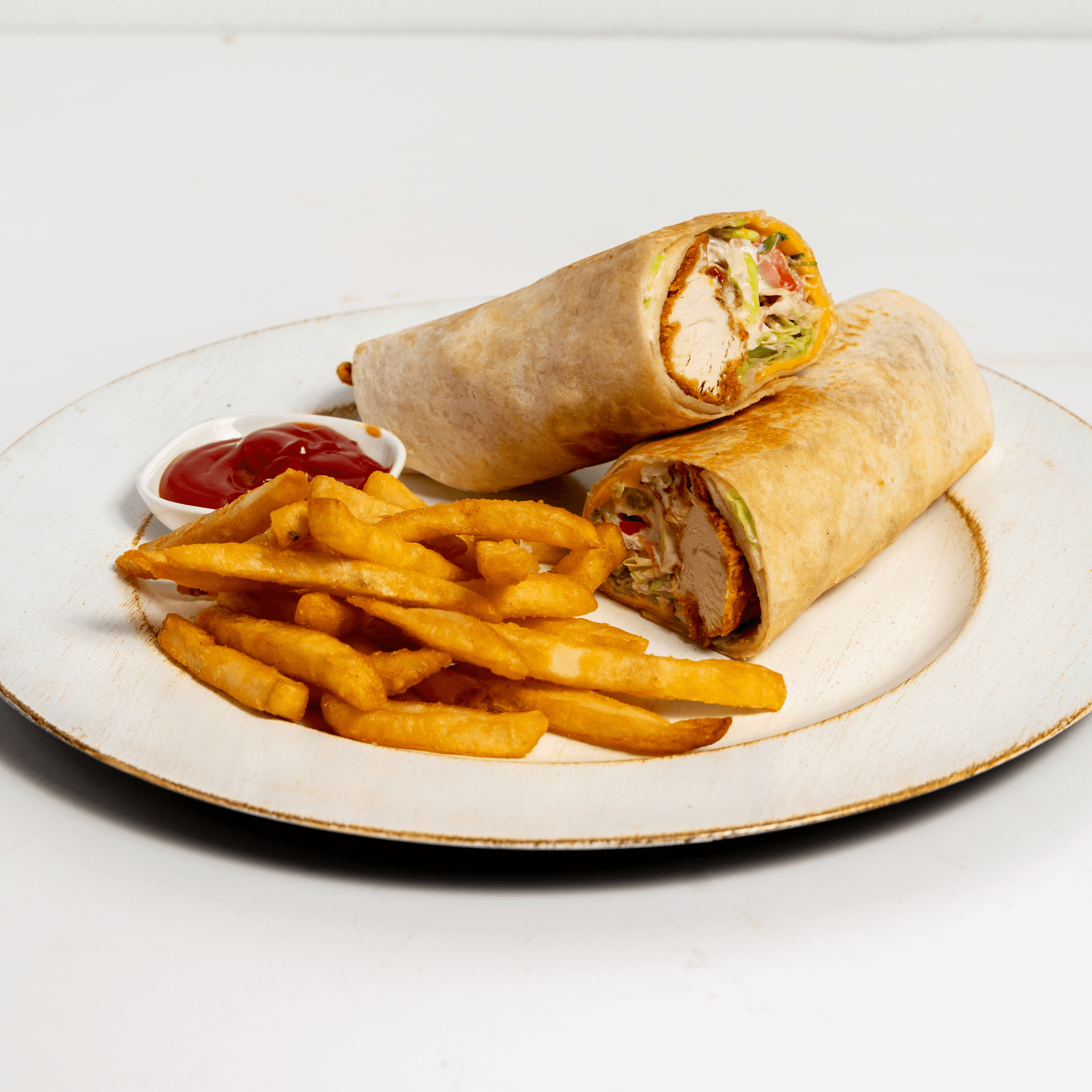 Crispy chicken wrapped in a soft tortilla with lettuce and tomato and cheese