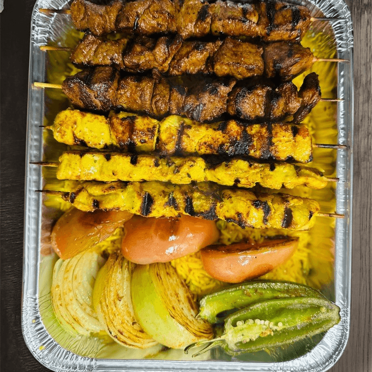 Includes 6 kebab skewers, half pan of rice, 3 pita breads, grilled vegetables, and large garden salad. Feeds 3-5 people chicken ,lamb, shrimp