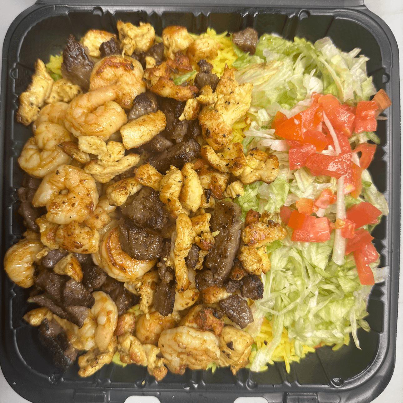Seasoned grilled shrimp into tender pieces, served over over a bed of fluffy yellow rice with fresh lettuce and tomato, drizzled with our signature white sauce