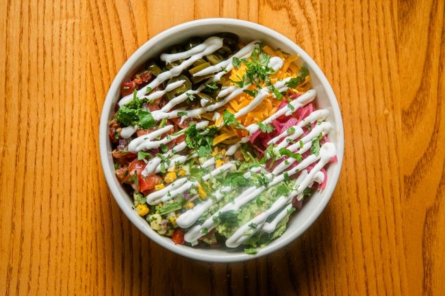 Tex-mex rice, borracho beans, pico de gallo, lime crema, cilantro, pickled jalapeños, cheddar cheese, guacamole, avocado corn salsa, pickled red onion