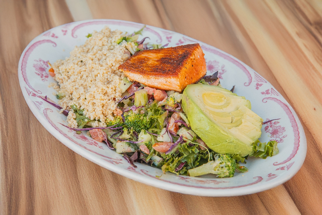 A healthy blend of mixed greens, tomatoes, cabbage, cucumbers and broccoli tossed in balsamic vin and topped with avocado and quinoa