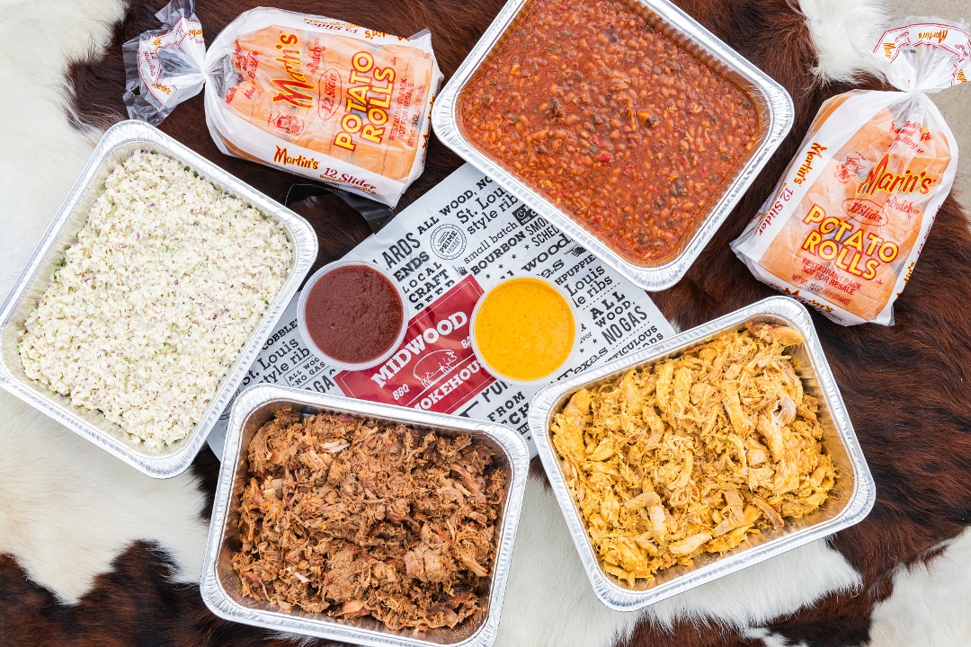 Feeds 8-10 people. Choice of 3 pounds of protein and 2 sides (1 qt each) Brisket is an additional $12/lb