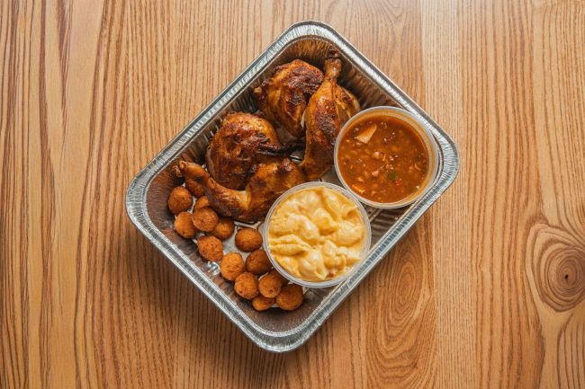 Tender, fall apart split chicken with your choice of SC Mustard or Midwood Sauce & 2 Sides