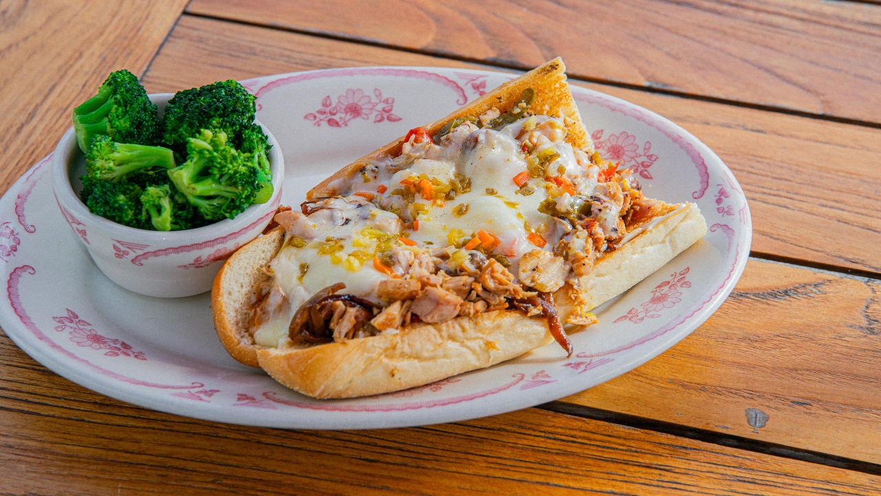 Chopped smoked chicken w/Cooper White American cheese, mayo, caramelized onions, peppers, and giardiniera on a traditional hoagie roll