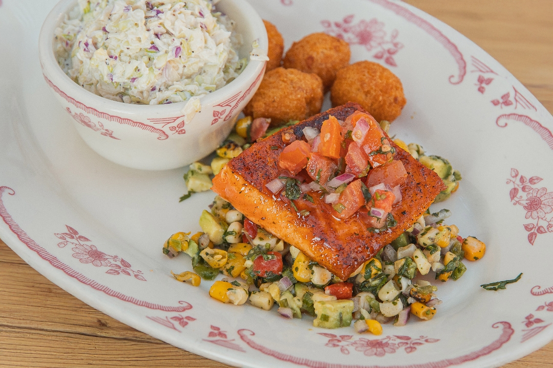 North Atlantic glazed salmon filet on a bed of avocado corn salsa and topped with pico de gallo, served with choice of one side